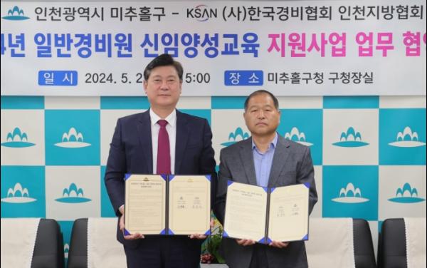 인천 미추홀구는 23일 구청장실에서 (사)한국경비협회 인천지방협회와 ‘2024년 일반경비원 신임양성교육 업무협약’을 체결했다.
