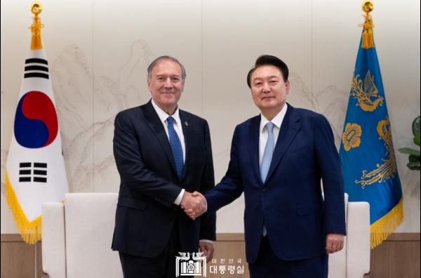 윤석열 대통령은 5월 23일 오후 '마이크 폼페이오(Mike Pompeo)' 전 미국 국무장관을 접견하고, 한미 동맹 발전 방안과 한반도 정세에 대해 의견을 교환했다.
