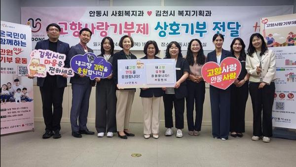 안동시 사회복지과와 김천시 복지기획과는 5월 23일 안동시청 융합실에서 고향사랑기부제를 응원하고 상호기부를 약속하는 전달식을 가졌다.