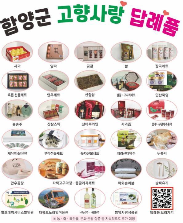 함양군은 고향사랑기부제를 통한 건전한 기부문화 조성과 기부자에게 함양군만의 특색있는 답례품을 제공하기 위해 답례품과 공급업체를 추가로 공개 모집한다.