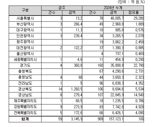 지역별로는 경상북도 1,260억 원, 경기도 361억 원, 경상남도 279억 원, 그 밖의 지역이 1,244억 원이다.