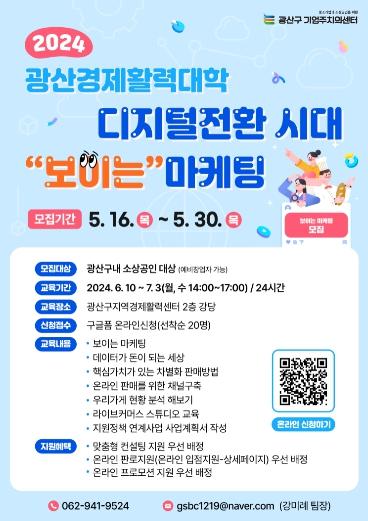 광주 광산구는 6월부터 소상공인을 위한 ‘디지털 전환 시대에 보이는 마케팅’ 전략 교육 과정으로 구성한 광산경제활력대학 4기를 운영한다고 밝혔다.