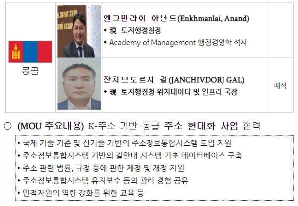 또한, 주소 관련 인적자원의 역량 강화 교육을 위한 인적 교류 등 몽골 주소 현대화 사업추진과 관련한 포괄적 협력을 약속했다.