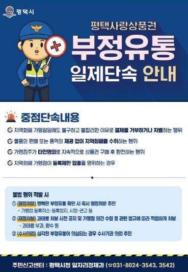 이번 부정 유통 단속의 중점 대상은 △평택사랑상품권을 부정한 방법으로 수취하고 환전하는 행위(속칭 ‘깡’) △등록 제한 업종이 상품권을 취급하는 행위 △평택사랑상품권을 현금과 차별하는 행위 등이다.