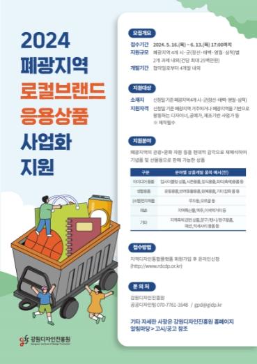 강원디자인진흥원은'2024 폐광지역 로컬브랜드 응용상품 사업화 지원'사업의 신청기업을 모집한다.