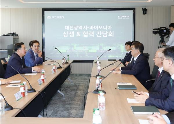 이장우 대전시장은 24일 대전시와 대덕특구 소통협력 강화를 위해 연중 추진하는 대덕특구 민간연구소·기업 행사의 두 번째로 (주) 바이오니아를 방문하여 간담회를 갖고 양 기관 상호협력을 논의했다.