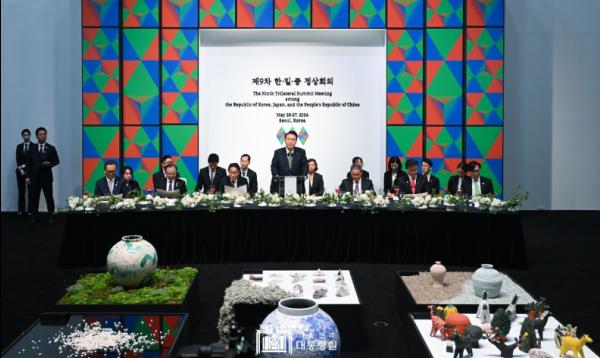 윤석열 대통령은 5월 26일 서울에서 제9차 한·일·중 정상회의에 참석한 기시다 일본 총리와 리창 중국 총리를 비롯한 3국 대표단을 환영하는 만찬을 함께했다.
