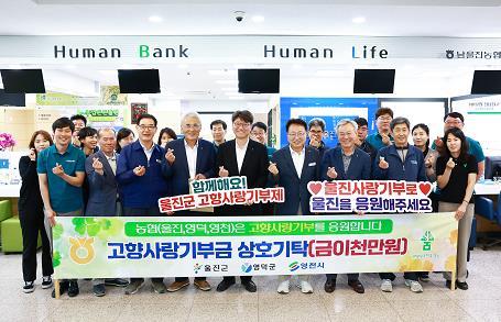 울진군은 울진?영덕과 울진?영천 농협 임직원 각 100명이 뜻을 모아 고향사랑기부금 1000만원씩을 각 지자체에 상호기부 하였다고 밝혔다.