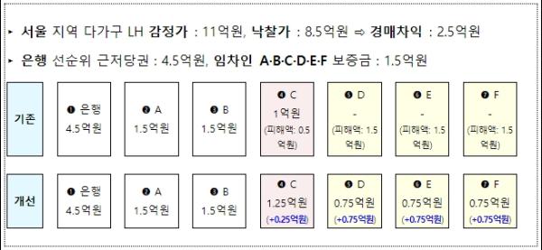 선순위 임차인이 거주 중인 피해주택의 경우 경매 시 보증금을 전액 돌려줘야 하므로 제3자의 경매 참여가 저조하여 피해자 본인의 낙찰이 불가피했으나, 이제는 공공이 보증금을 인수하지 않는 조건으로 매입하고, 경매차익을 활용하여 지원할 수 있도록 한다.
