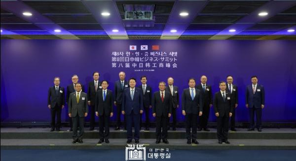 윤석열 대통령은 5월 27일 오후 대한상공회의소 국제회의장에서 열린 '제8차 한일중 비즈니스 서밋'에 기시다 후미오 일본 총리, 리창 중국 총리와 함께 참석했다. 한일중 정상회의를 계기로 열린 오늘 행사는 대한상공회의소, 일본 경제단체연합회, 중국 국제무역촉진위원회가 공동으로 주관했다.