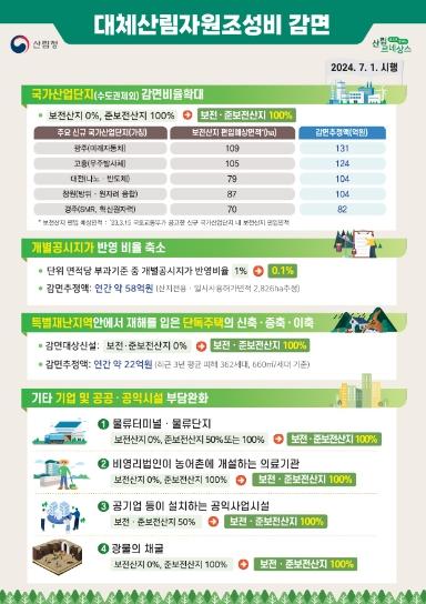 또한, 산림청은 오는 7월 1일 개정안 시행에 따라 ‘2024년 대체산림자원조성비 단위면적당 금액 변경 고시’를 통해 대체산림자원조성비 부과금액 중 개별공시지가 반영비율을 기존 1%에서 0.1%로 경감할 계획이다.