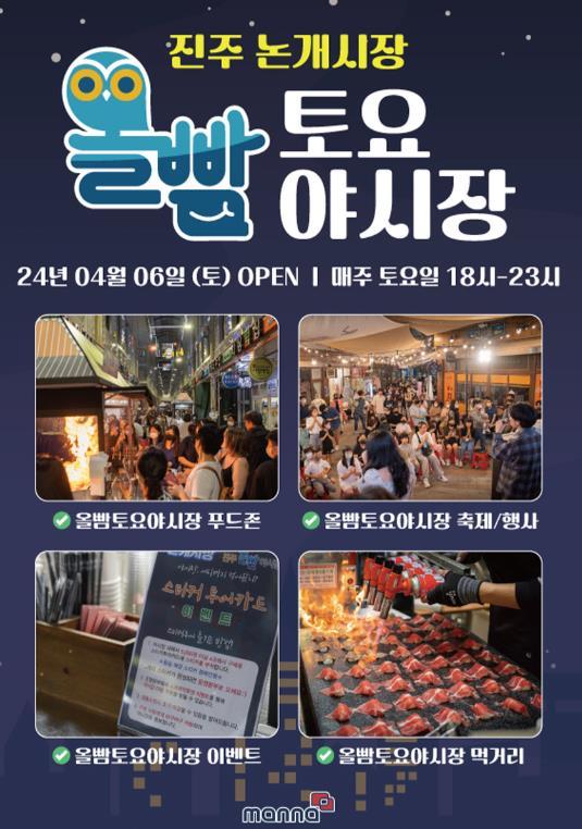 진주시가 위축된 전통시장 상권을 활성화하고 야간 및 체류형 관광객 유치를 위해 2022년도부터 운영하고 있는 관내 유일한 야시장인 ‘올빰야시장’이 매주 2000여 명의 관광객이 찾을 정도로 큰 인기를 모으고 있다.