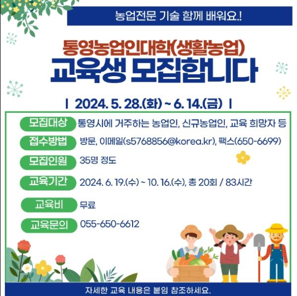 통영시는 미래농업ㆍ농촌의 가치를 실현할 인재를 양성하기 위해 내달 14일까지 ‘2024년도 통영농업인대학(생활농업과정)’ 제13기 교육생 35명을 모집한다.