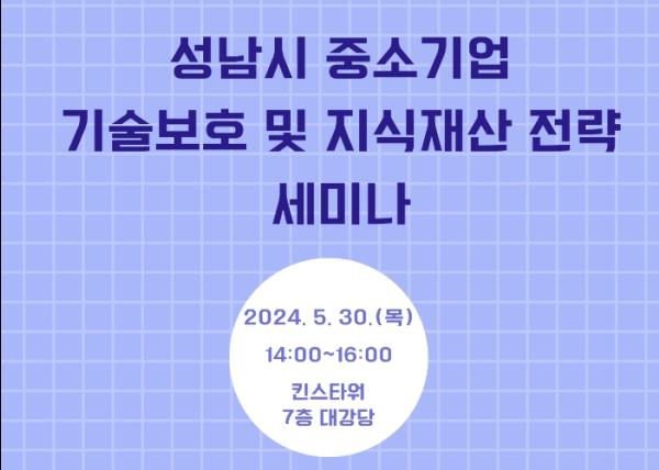 성남산업진흥원은 오는 5월 30일 오후 2시에 킨스타워 대강당(7층)에서 ‘성남시 중소기업 기술 보호 및 지식재산 전략 세미나’를 개최한다.