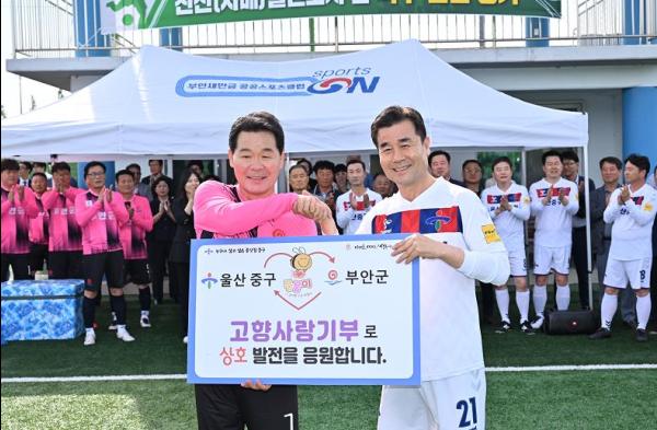 울산 중구와 전북 부안군이 지난 5월 27일 오후 4시 30분 부안스포츠파크에서 열린 ‘자매 친선도시 교류행사’ 공식 행사에서 고향사랑기부금 200만 원을 상호 기부했다.