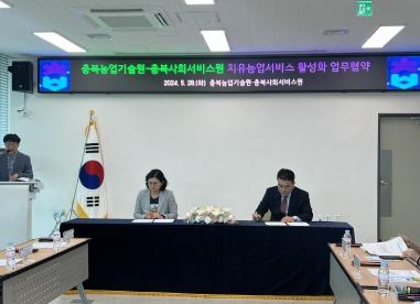 충북농업기술원은 5월 28일 충북사회서비스원과 치유농업 사회서비스 연계 활성화 협력체계 구축을 위한 업무협약을 맺었다고 밝혔다.