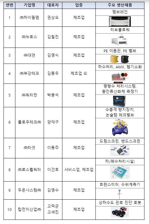 10개사는 △하이필엠, △뉴로스, △대연, △부강테크, △워터핀, △플로우테크, △타셋, △로스웰워터, △두온시스템, △탑전자산업 등이다.