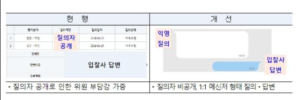 ‘1:1 무기명 질의답변 시스템’을 마련하여, 질의자를 익명으로 처리하고, 입찰사와 1:1 메신저 형태로 질의답변하도록 개선한다.