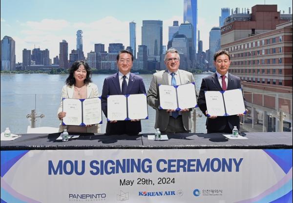 이날 체결식에는 유정복 인천시장을 비롯, 파나핀토 글로벌 파트너스 죠셉 파나핀토 주니어(Joseph Panepinto Jr.) 회장, 대한항공 관계자, 디피인터내셔날 대표가 참석해 양해각서에 서명했다.