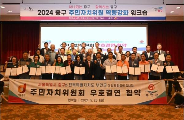 서울 중구의 각 동 주민자치위원회와 전북특별자치도 부안군의 읍(면) 주민자치위원회가 지난 28일 우호교류 협약을 체결했다. 지난해 중구와 부안의 우호협약에 이어 주민자치위원회간에 이뤄진 업무협약으로 두 주민자치위원회의 전체 동(읍면)이 협약을 맺은 것은 이번이 전국 최초 사례다.
