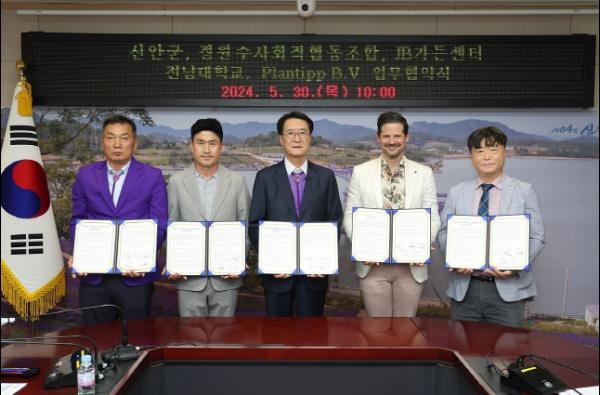 협약식에는 신안군, 신안군정원수사회적협동조합, 대림묘목농원(JB가든센터), 전남대학교(원예생명공학과), 네덜란드의 Plantipp B.V.가 참여했다.