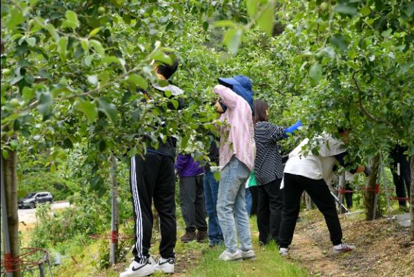 이날 직원들은 바쁜 업무를 잠시 내려놓고 영주댐 수변도로를 굽이돌아 위치한 과수원에서 열매솎기 작업에 구슬땀을 흘리며, 농사의 힘겨움과 농촌의 어려운 현실을 공감하는 뜻깊은 시간을 보냈다.