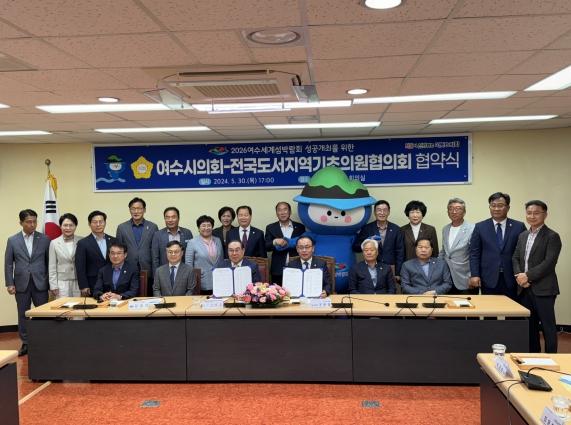 전국도서지역기초의원협의회와 여수시의회가 2026여수세계섬박람회 성공개최를 위한 협약식을 맺었다.