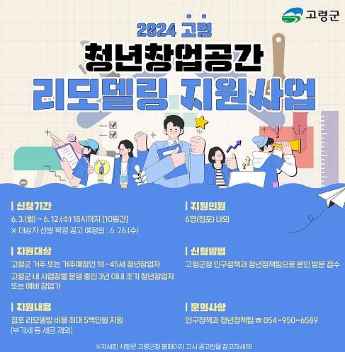 고령군은 금년 6월 3일부터 6월 12일까지 10일간 '고령군 청년 창업공간 리모델링 지원사업' 참여자를 모집한다.
