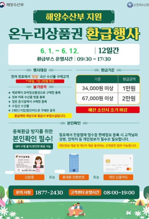 국내산수산물 온누리상품권 환급행사는 수산물 체감물가 완화와 소비 활성화를 도모하고자 매년 명절과 상반기에 집중 실시해 수산물 소비 촉진과 전통시장 활성화에 기여하고 있다.