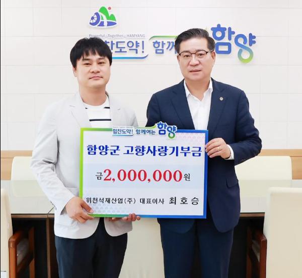 함양군을 아끼고 사랑하는 마음을 담아 최호승 거창 위천석재산업(주) 대표이사가 고향사랑기부제에 고액(200만 원)의 기부금을 전달했다.