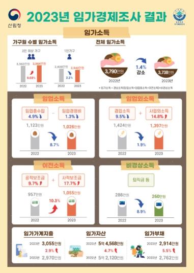 조사 결과 2023년 1인 임가의 소득은 전년 대비 2.2% 감소한 2,542만 원으로 나타났으나 2인 이상 임가는 0.03% 증가한 3,964만 원으로 조사됐다. 1인 임가를 포함한 전체 임가소득은 전년 대비 1.4% 감소한 3,738만 원으로 나타났다.