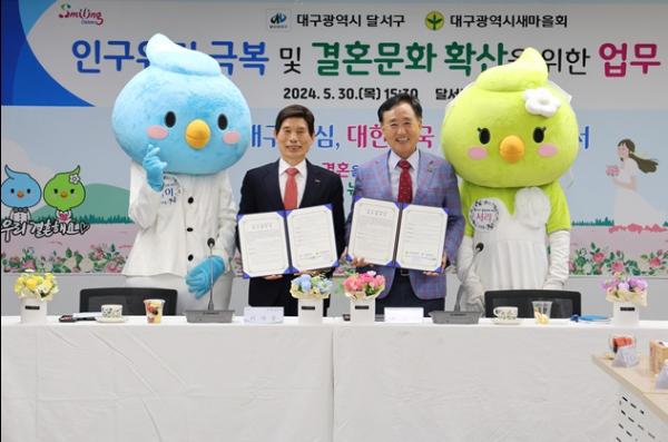 대구 달서구가 30일 구청 회의실에서 대구광역시새마을회와 초저출생 인구 위기에 공동 대응하고, 긍정적 결혼(출산)문화 확산 등을 위한 업무협약을 체결했다.