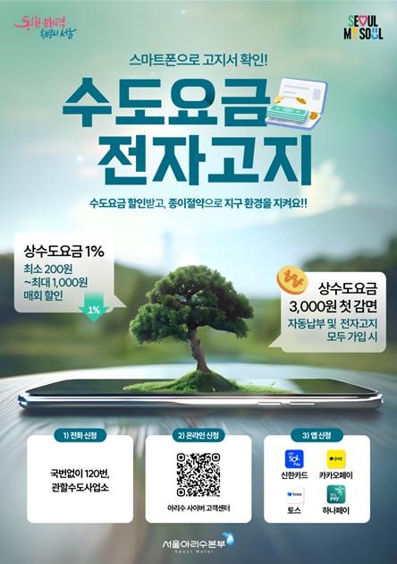 서울시는 3일부터 수도요금 청구를 메일, 문자 등으로 받는 전자고지와 자동납부를 모두 신청하면 최초 1회에 한해 3천 원 감면한다고 밝혔다. 기존에 전자고지와 자동납부 서비스를 동시에 이용하고 있는 가입자도 변경약관(체납분 포함)에 동의 시 동일한 감면 혜택을 받을 수 있다.
