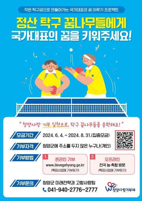 청양군은 금년도 첫 고향사랑 지정 기부 모금 사업이 6월 4일 시행에 따라 전국대회에서 우수한 성적을 내고 있고, 전학생 증가로 청양군에 희망을 심어주고 있는 ‘정산 초·중·고 탁구부 훈련용품 및 대회출전 비용 지원’ 사업을 제1호로 모금에 나선다고 밝혔다.