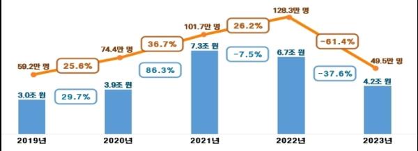 ’22년과 비교하면 납세인원은 128.3만 명에서 78.8만 명이 줄어 61.4%가 감소했고, 결정세액은 6.7조 원에서 2.5조 원이 줄어 37.6%가 감소했다.