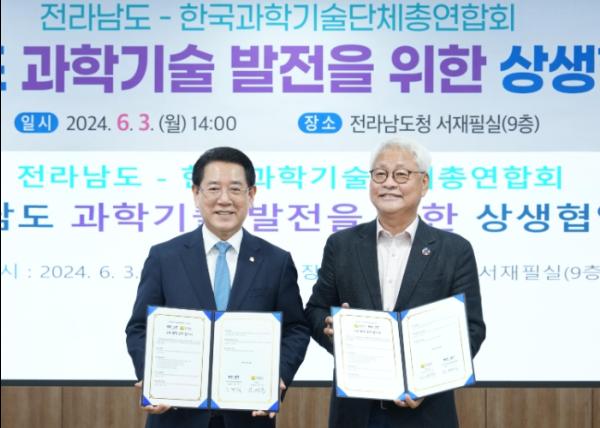 전라남도는 3일 한국과학기술단체총연합회(회장 이태식)와 지역 과학기술발전과 첨단산업 육성을 위한 교류·협력 업무협약을 했다.