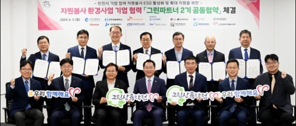 인천광역시는 6월 3일 시청 소통회의실에서 인천시 기업 사회가치경영(ESG) 연계 자원봉사 활성화 및 사회적 가치 창출을 위해 ‘그린파트너 2기 공동협약’을 체결했다고 밝혔다.