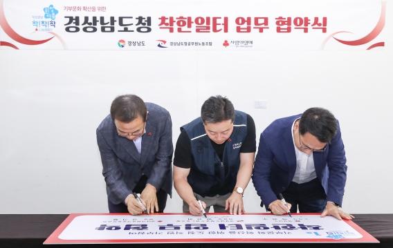 경상남도는 3일 경남도청에서 공동모금회 기부 프로그램인 ‘착한일터’ 업무협약을 맺었다.