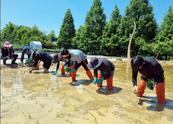 정읍시농업기술센터 직원 10여명은 지난 3일 정읍시 제2청사 내 벼 품종 전시포에서 손 모내기를 했다.
