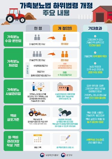 '가축분뇨법' 하위법령 개정은 가축분뇨 처리·활용 기술의 발전 및 업계 애로사항을 고려하여 가축분뇨 수집·운반업과 처리업의 기술인력 허가기준 개선 등 현장 여건에 맞는 합리적인 제도가 도입되며, 이달 중에 법제처 심사를 거쳐 다음 달 중으로 국무회의 의결 후 공포된다.