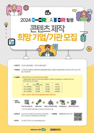 경기도와 경기콘텐츠진흥원은 도내 중소기업, 시군, 공공기관 등의 홍보영상 제작을 돕기 위해 1인 크리에이터(온라인 영상 창작자)를 활용한 ‘2024 지-크리에이터(G-CREATOR) 멤버십’ 사업의 희망기업·기관(중소기업, 시군, 공공기관 등)을 14일까지 모집한다.