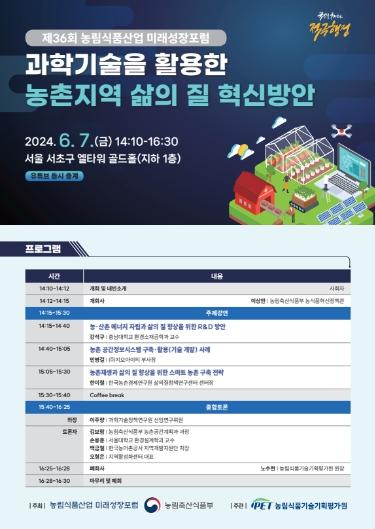 농림축산식품부는 “과학기술을 활용한 농촌지역 삶의 질 혁신방안”을 주제로 하는 ?제36회 농림식품산업 미래성장포럼?을 6월 7일 서울 엘타워에서 개최한다.