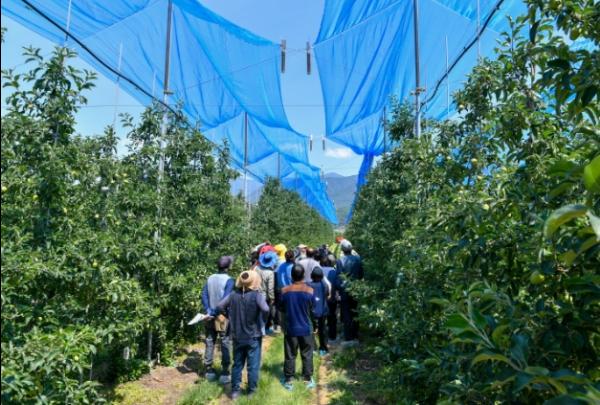 경북 영주시는 5일, 봉현면 두산리의 사과원에서 ‘기후변화 재해 대응 우박 방지망 개발 시험’ 평가회를 개최했다.