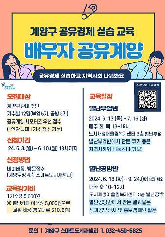 사업 내용은 3단계로 ▲기초 이론교육 ‘반가워 공유계양’, ▲실습교육 ‘배우자 공유계양’, ▲홍보캠페인 및 성과공유전시회 ‘함께 해요 공유계양’으로 운영되며, 교육은 효성동에 위치한 도시재생어울림복지센터 내 공유공간에서 진행된다.