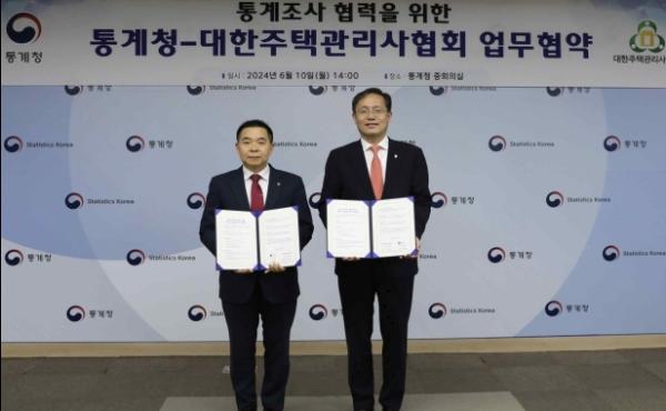 통계청과 대한주택관리사협회(회장 하원선)는 2024년 6월 10일 정부대전청사에서 공동주택 대상 통계조사 협력을 위한 업무협약(MOU)을 체결했다.