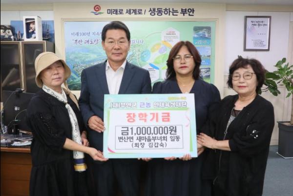 부안군 변산면 새마을부녀회는 지난 10일 부안군 근농인재육성재단을 방문하여 마실축제 기간동안 먹거리 부스를 운영한 수익금 100만원을 지역 인재육성을 위해 써달라며 장학금으로 기탁했다.
