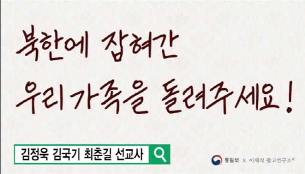 통일부는 북한의 구금 시설에 억류되어 있는 김정욱·김국기·최춘길 선교사와 그 가족들의 아픔을 더 많은 국민들이 공감하고 조속한 문제 해결에 함께해 주실 수 있도록 지난 3월부터 홍보 영상 제작을 추진했다.