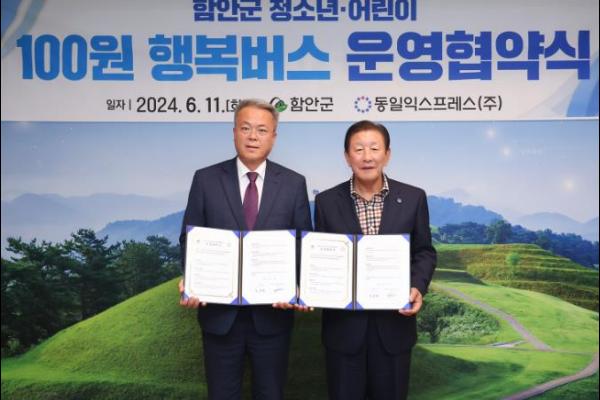 함안군은 11일 동일익스프레스(주)와 청소년·어린이 100원 행복버스 시행을 위한 업무협약을 체결했다.