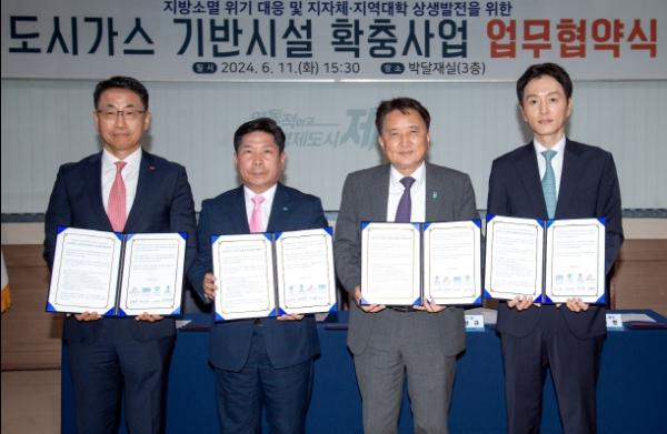 제천시는 11일 시청에서 충청북도, 충청에너지서비스(주), 세명대학교와 지방소멸 위기 대응 및 지자체·지역대학 상생발전을 위한 도시가스 기반시설 확충사업 업무협약을 체결했다.
