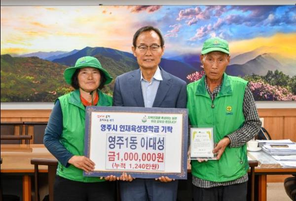 이대성·황영숙 씨는 “작은 정성이지만 어려운 학생들이 공부하는 데 조금이나마 도움이 되고 싶어 장학금을 기탁하고 있다”며 “폐지 수거에 많은 도움으로 줘 장학금 기탁을 가능하게 해준 영주1동 주민분들께 감사하다”고 기탁 소감을 밝혔다.